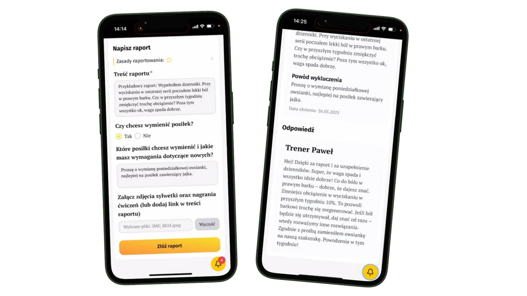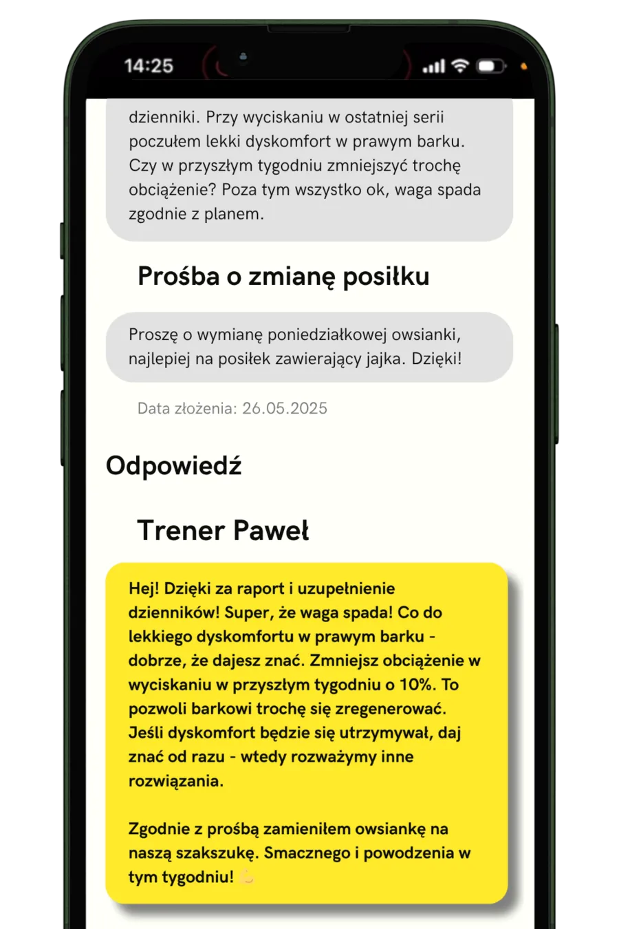 Wysyłasz raport po tygodniu – trener odpowiada w 24 h z komentarzem i korektami.